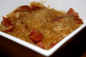 What to do with Chinese leftovers. Too little for dinner for two, too much for a snack. The best solution is just to make more Chinese food! To go with our roast duck (no, we haven’t attempted this one yet), chow fun and pot stickers I made sai fun with lop cheong (bean thread noodles with Chinese sausage) and napa cabbage stir fried in the wok with oil, salt and plenty of freshly minced garlic. Simple foods, but so tasty!